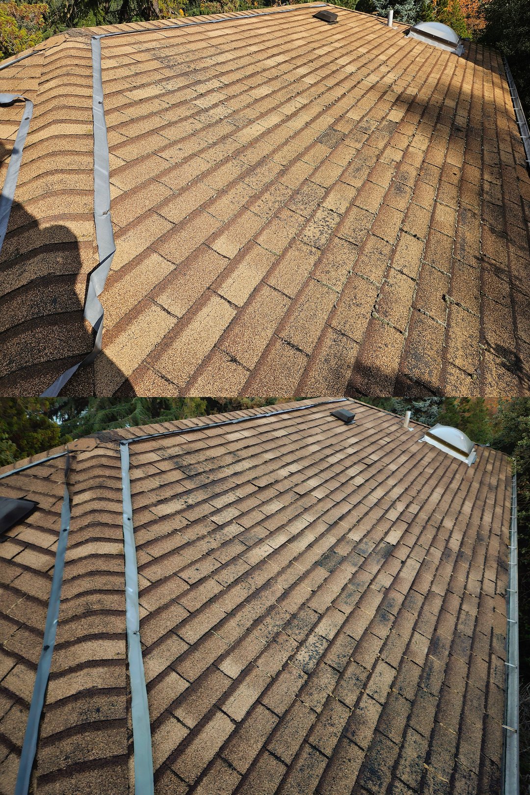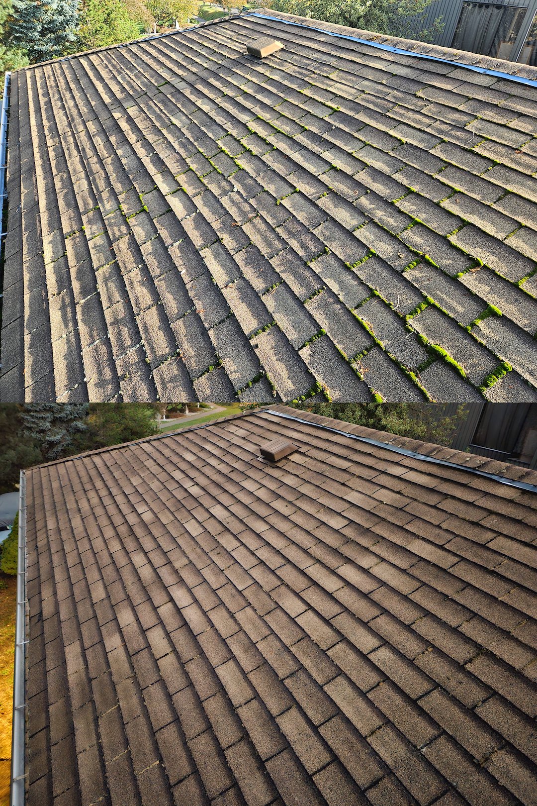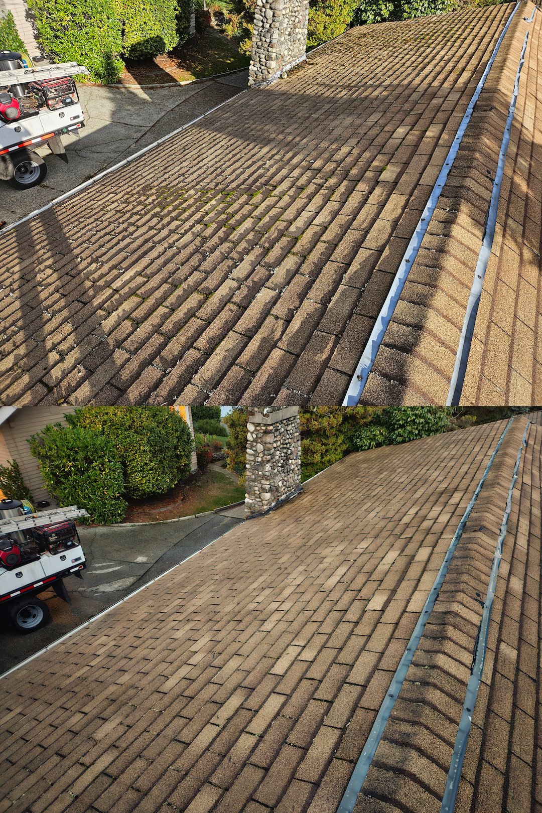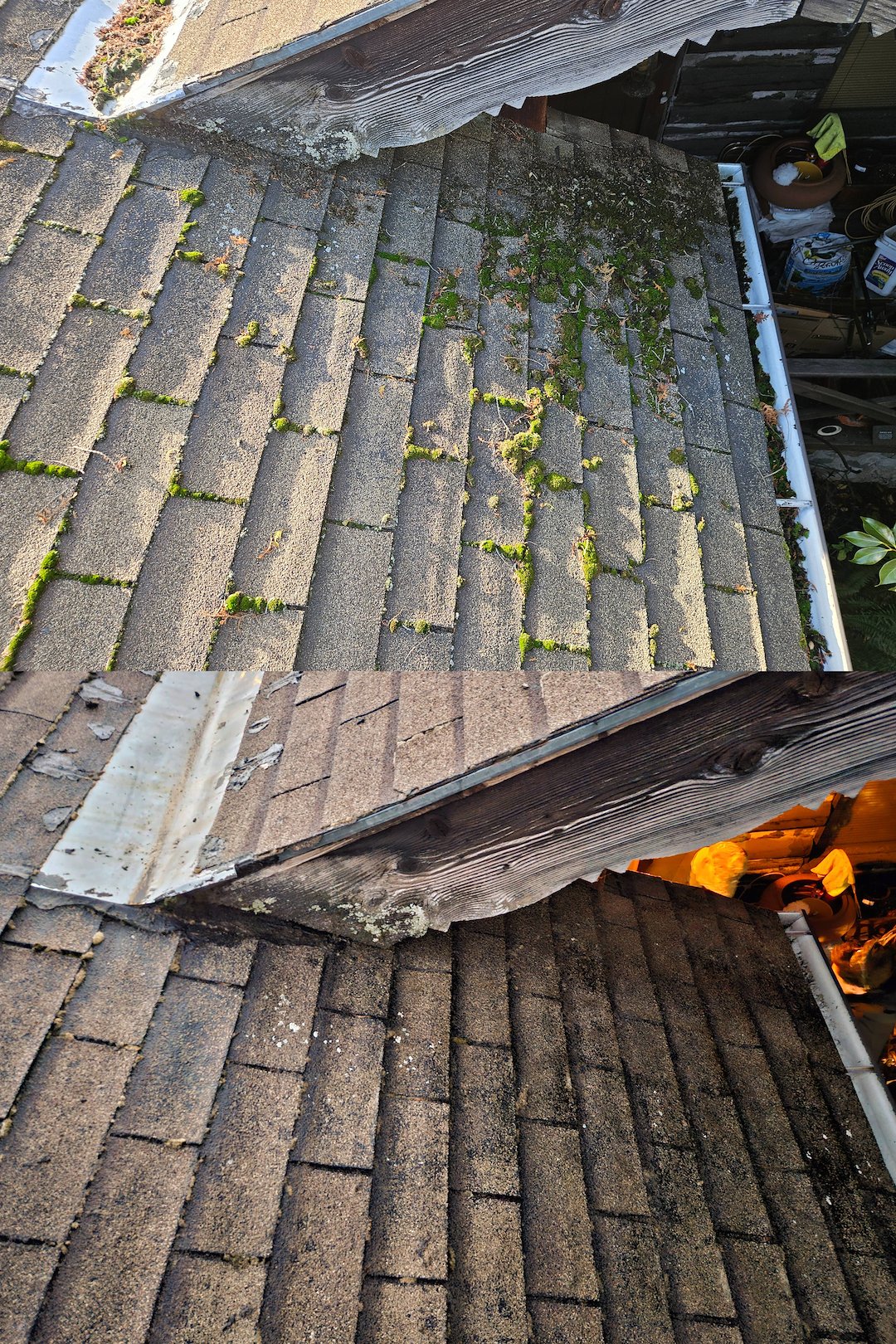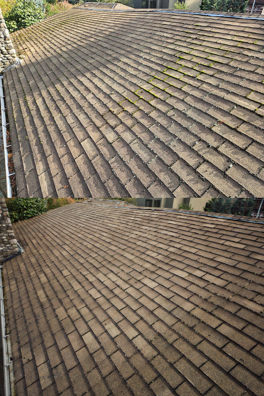 In this service request for roof cleaning in Seattle, we came out to remove the moss and apply a liquid soft wash application for the roof surfaces. We discovered that the roof had been through most of it's useful life and after confirming with the homeowners that they would like to keep the roof in as good as possible shape until a favorable time to replace it, we proceeded to provide services. With this service request, we start by removing the existing moss and organic material with use of a non-abrasive rubber floor squeegee to ensure we are not removing granules from the roof like using a bristle brush would. We then use blowers to carefully remove the loosened organic material from the roof surfaces and follow by blowing out the remaining contents in the gutter systems. After we prepare the roof surfaces and gutter internals, we then apply our liquid soft wash solution to the roof surfaces to ensure all organic growths have been effectively neutralized.