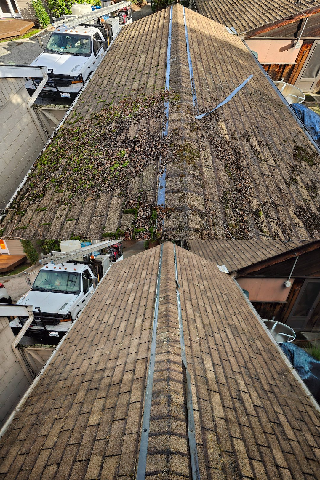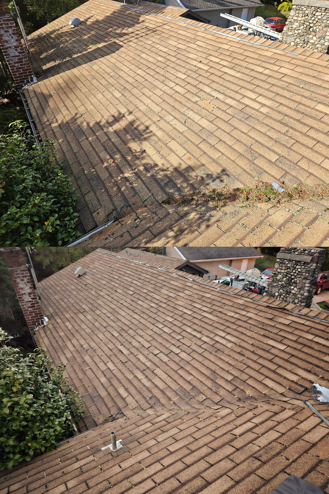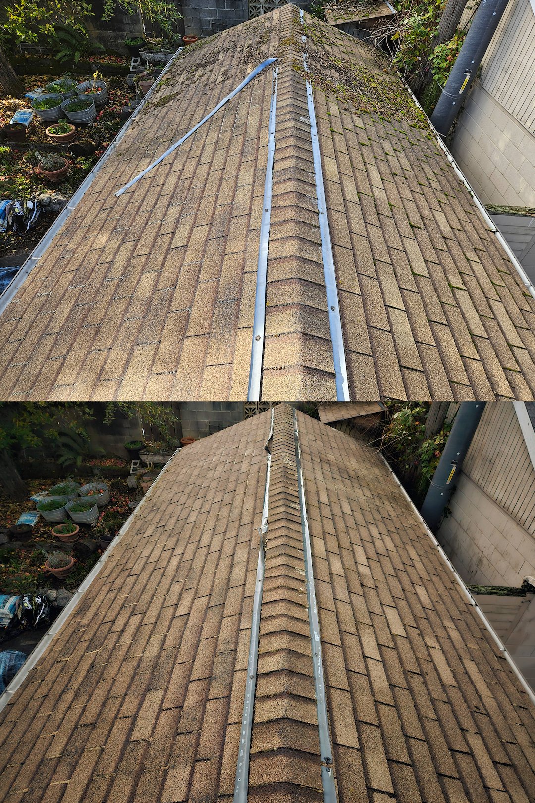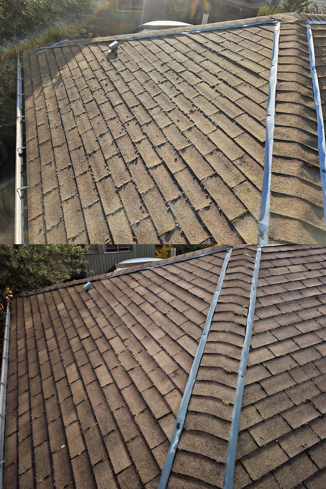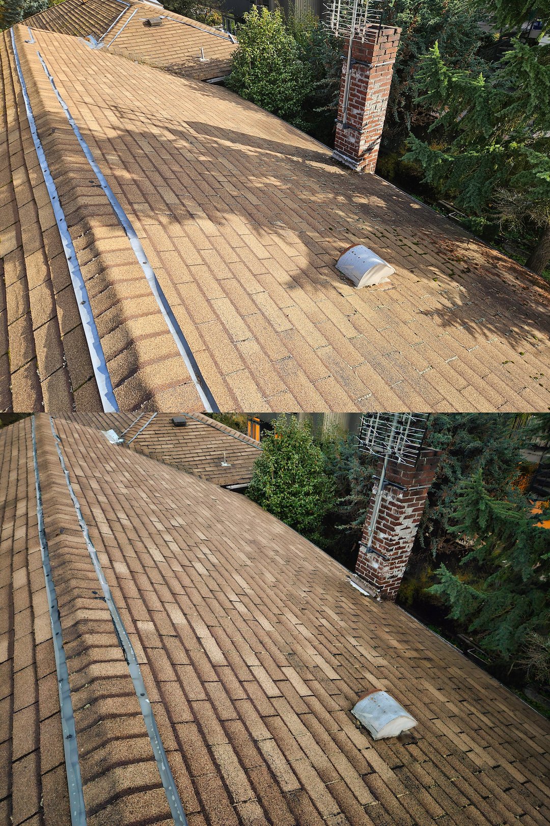 In this service request for roof cleaning in Seattle, we came out to remove the moss and apply a liquid soft wash application for the roof surfaces. We discovered that the roof had been through most of it's useful life and after confirming with the homeowners that they would like to keep the roof in as good as possible shape until a favorable time to replace it, we proceeded to provide services. With this service request, we start by removing the existing moss and organic material with use of a non-abrasive rubber floor squeegee to ensure we are not removing granules from the roof like using a bristle brush would. We then use blowers to carefully remove the loosened organic material from the roof surfaces and follow by blowing out the remaining contents in the gutter systems. After we prepare the roof surfaces and gutter internals, we then apply our liquid soft wash solution to the roof surfaces to ensure all organic growths have been effectively neutralized.