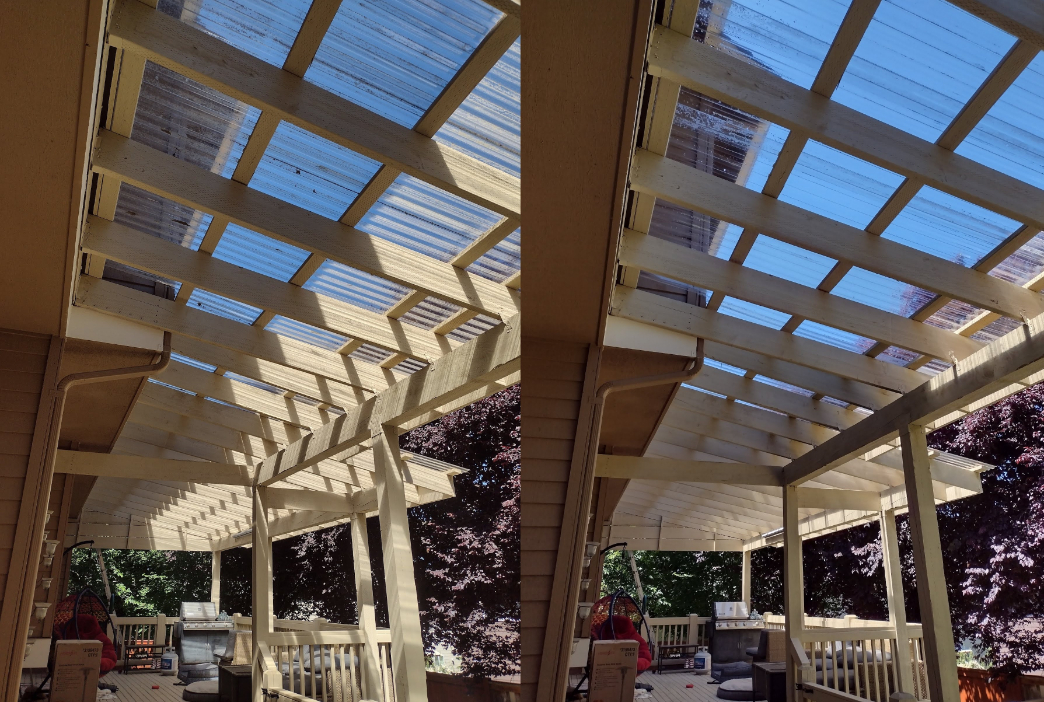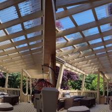 Today we washed a sun roof covering the back deck. It is normal for all roofs to gather pine needles, sticks, branches and other organic growth like moss, mildew and algae; that is why it is important to regularly maintain the cleanliness of the roof surface. This type of roof that uses beams and polycarbonate sheets requires a specialized method of cleaning different from other types of roofs such as asphalt shingles. We used our naturally biodegradable solution that targets organic growth followed by a precise rinsing of water to ultimately restore the look, feel and sunshine this roof has to offer.